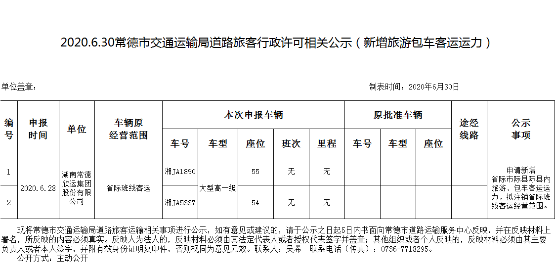 常德市交通运输局道路旅客行政许可相关公示(新增旅游包车客运运力)