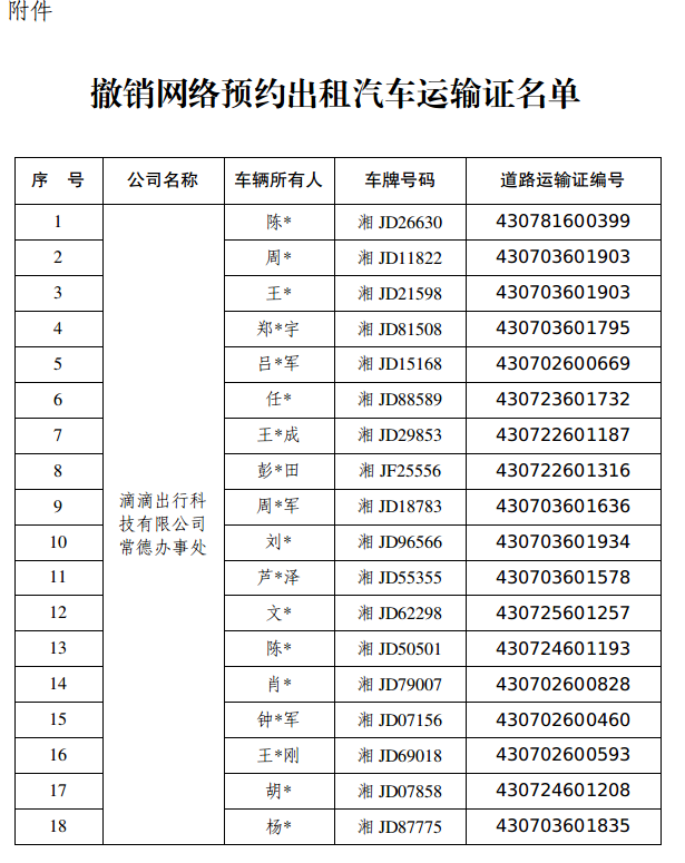近日,我局收到滴滴出行科技有限公司常德办事处《关于注销18辆网络预约出租汽车运输证的申请》。该公司在开展安全隐患排查时,发现平台部分网络预约出租汽车车载卫星定位装置长期离线且多次要求整改拒不配合落实。