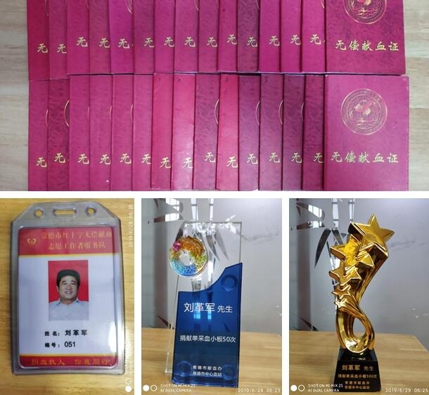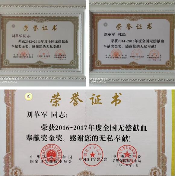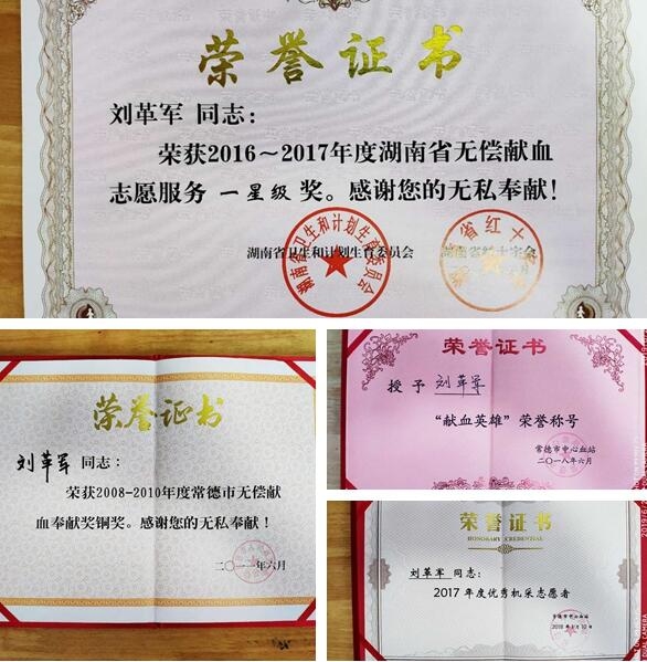 为此,刘革军先后三次荣获全国无偿献血奉献金奖,湖南省无偿献血志愿服务“一星级奖”,常德市“献血英雄”等一系列的光荣称号,这一张张荣誉奖状,以及一本本鲜红的献血证,是刘革军坚持无偿献血的证明与肯定,然而,刘革军却不以此为傲,依然默默地奉献着……。