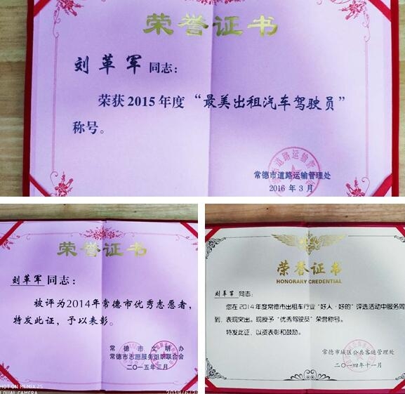 同时,作为一名出租车驾驶员,刘革军从入行到现在,零投诉、零违章、零交通事故,多年来一直勤勤恳恳,对每位乘客都能提供热情、周到、细致的服务,发生在他身上拾金不昧、助人为乐的好人好事举不胜举。尤其是拾金不昧,手机、行李箱、钱包等失物,他全部及时归还失主,诚信营运的他深受乘客和其他驾驶员的赞扬。他的担当,他的善良,得到同行们的一致认可和好评。2014年常德市优秀志愿者,2014年常德市“好人.好的”评选活动“优秀驾驶员”,2015年度“最美出租车驾驶员”,众多荣誉就是对他从业操守的充分肯定。