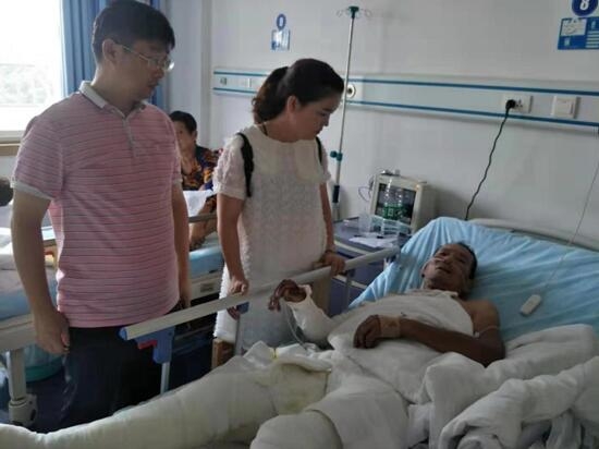 8月19日上午,鼎城区交通运输局扶贫分管领导朱海峰、工作队长郑敬、结对帮扶人张自力来到常德烧伤整形医院,看望慰问严重烧伤住院的十美堂教育村十三组贫困户罗付保。
