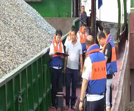 在桃源水电站枢纽上游停泊区,对等待过闸的100多艘运沙船进行抽查,测量船舶吃水,严防船舶超载,并对船舶是否适航、船员是否适任、是否违反船舶停泊值班制度等情况进行重点检查。