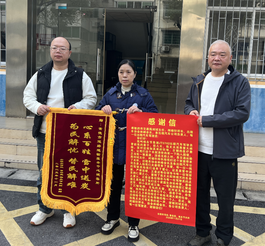 11月24日,湘JT0782个体出租车司机曾伯亮的妻子杨永节、常德市城区公共客运行业协会会长林峰为常德市道路运输服务中心送来“心系百姓 雪中送炭 为民解忧 替民解难”锦旗和感谢信,感谢管理部门在其丈夫曾伯亮和家庭危难之际伸出援手、奉献爱心的善义之举。