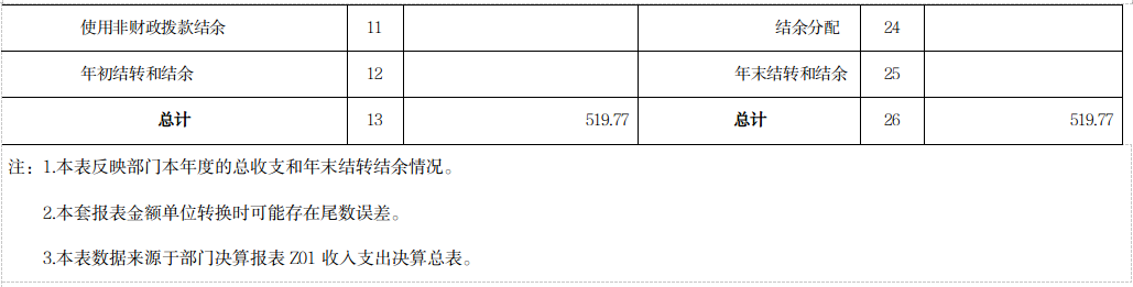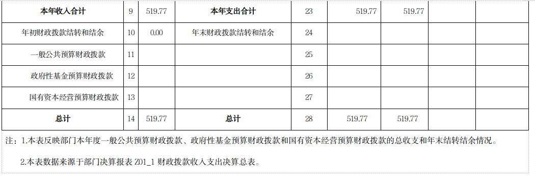 2022年度收入合计519.77万元,其中:财政拨款收入519.77万元,占100%;上级补助收入0万元,占0%;事业收入0万元,占0%;经营收入0万元,占0%;附属单位上缴收入0万元,占0%;其他收入0万元,占0%。