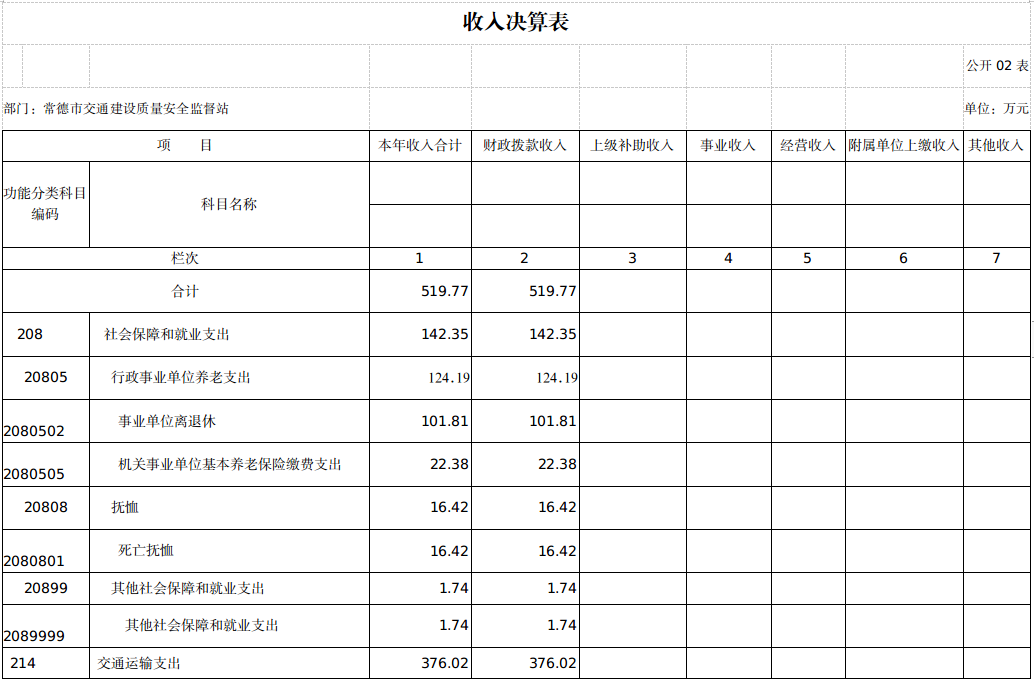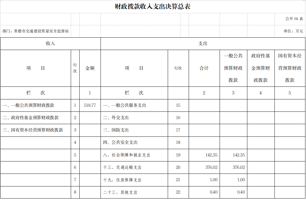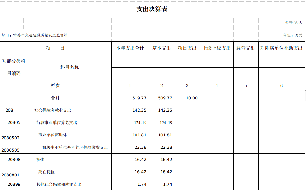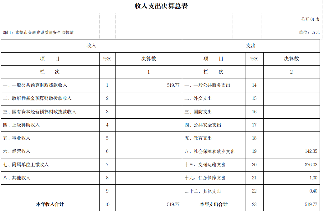 根据财政预算制定,本单位无所属预算单位,纳入2022年编制范围的为市交通建设质量安全监督站单位本级。市交通建设质量安全监督站单位2022年度收入合计519.77万元,其中财政补助收入519.77万元;支出总计519.77万元,其中:基本支出509.77万元,项目支出10万元,无结余。2022年度支出主要包括:人员支出479.2万元、商品和服务支出40.57万元。