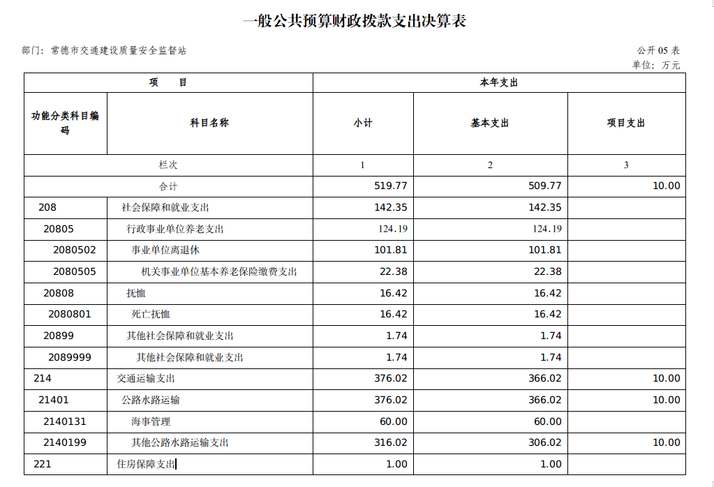 2022年度财政拨款支出519.77万元,主要用于以下方面:社会保障和就业(类)支出142.35万元,占27.39%;交通运输(类)支出376.02万元,占72.34%;住房保障支出(类)支出1.00万元,占0.19%;其他(类)支出0.40万元,占0.08%。