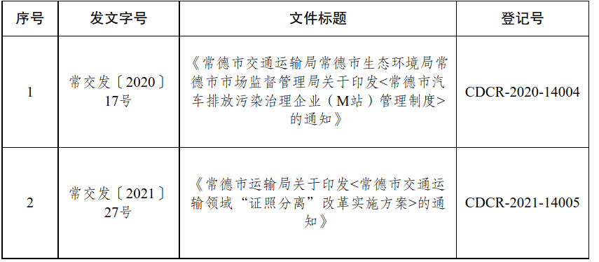 一、重新公布《常德市交通运输局常德市生态环境局常德市市场监督管理局关于印发<常德市汽车排放污染治理企业(M站)管理制度>的通知》(常交发〔2020〕17号)等2件规范性文件(见附件1)。