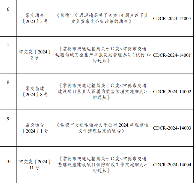 根据《湖南省规范性文件管理办法》的规定,按照《常德市人民政府办公室关于开展规范性文件清理工作的通知》(常政办函〔2025〕15号)的要求,我局对以市交通运输局名义单独或牵头发布的规范性文件进行了全面清理。现将清理结果通告如下: