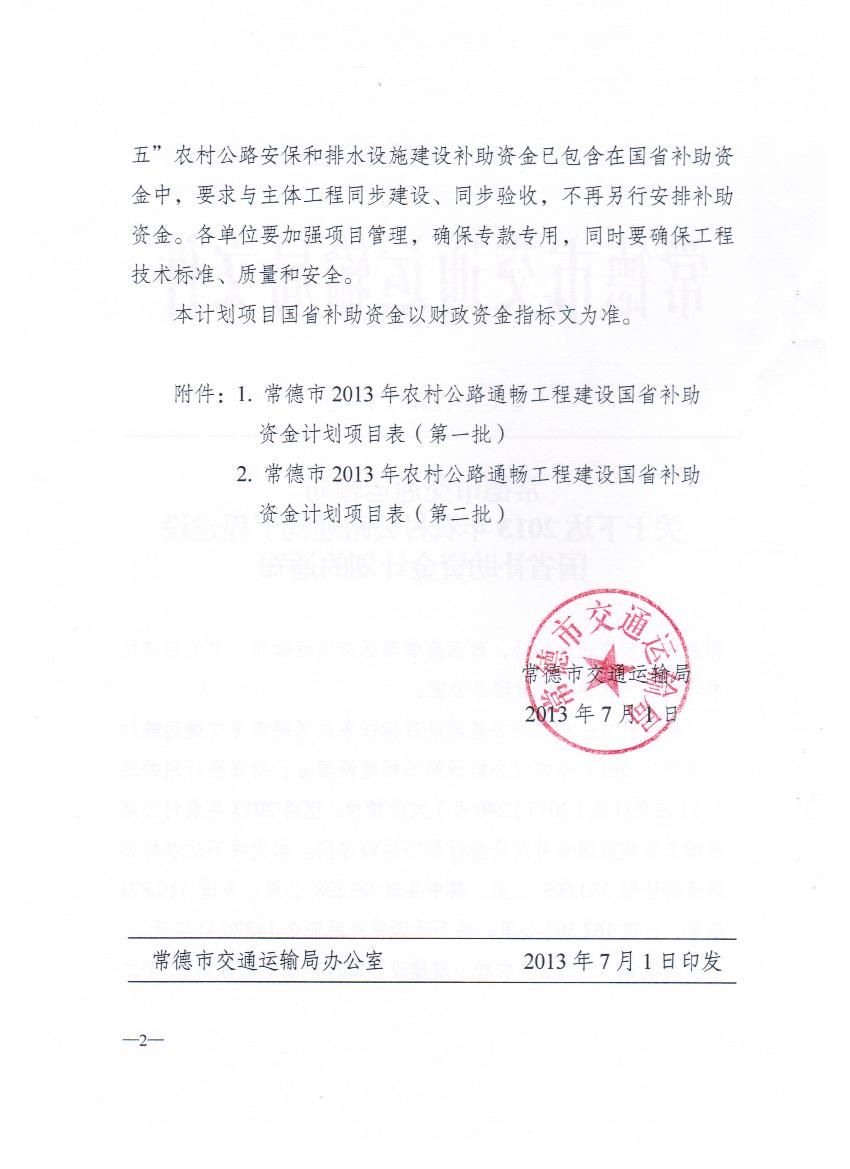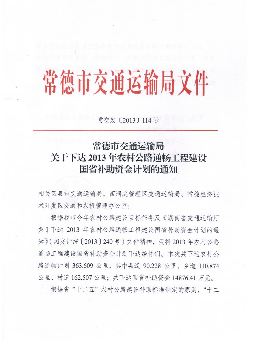 常德市交通运输局关于下达2013年农村公路通畅工程建设国省补助资金计划的通知