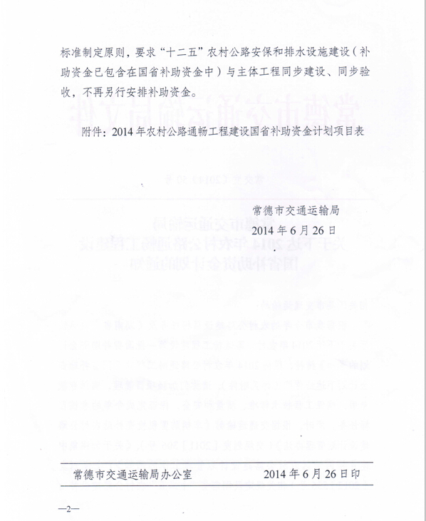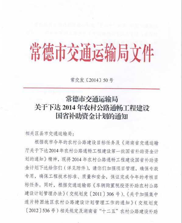 常德市交通运输局关于下达2014年农村公路通畅工程建设国省补助资金计划通知